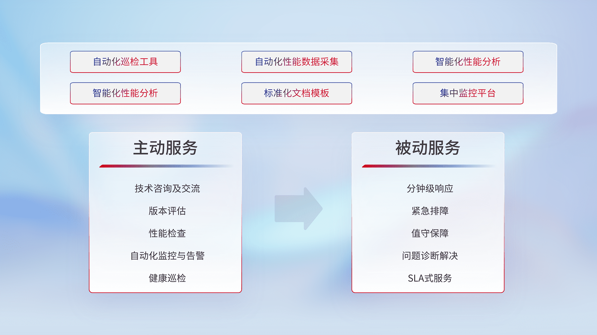 智能化工具和标准化文档,,,保障服务质量,,提供主动服务(包含技术咨询、、版本评估、、、、性能检查、、自动化监控与告警、、、健康巡检)和被动服务包含(分钟级响应、、、紧急排障、、、值守保障、、问题诊断解决、、、、SLA服务)。。。。